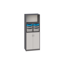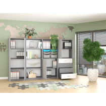 Regał ULTRA 214 to funkcjonalny mebel łączący otwartą przestrzeń, pojemniki oraz zamykaną szafkę — idealny do przechowywania różnorodnych materiałów biurowych, szkolnych lub edukacyjnych. W górnej części znajduje się otwarta półka, poniżej umieszczono 4 małe oraz 2 średnie pojemniki plastikowe o wymiarach (W × S × G) 75 × 312 × 427 mm. Pojemniki osadzone są na prowadnicach plastikowych z zabezpieczeniem przed wypadaniem, co zapewnia wygodę i bezpieczeństwo użytkowania. Dolna część regału to 2 przestrzenie do przechowywania, zamykane parą drzwi bez zamka. Mebel wykonany z płyty laminowanej o grubości 18 mm, a tył z białej płyty HDF o grubości 3,5 mm, co gwarantuje solidność i trwałość konstrukcji.